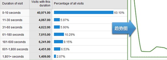 當然,經過網站建設行業的同行們的總結一分析,我們發現基本上除了那些很特殊的行業網站以外,都會存在這樣的訪問規律。因此,我們都認為,網站訪客的轉化率的分水嶺是1分鐘這個點。但是通過上面圖片的研究,我們發現,停留時間小于1分鐘的訪客數量遠遠大于超過1分鐘的訪客數量。因此,我們認為一個網站如果要得到長足的發展,那么將那些瀏覽時間很短的訪客轉化為超過1分鐘的訪客非常有必要。而且,我們也發現,只要適當的提高網站的用戶體驗,那么,這個情況就會得到推進。